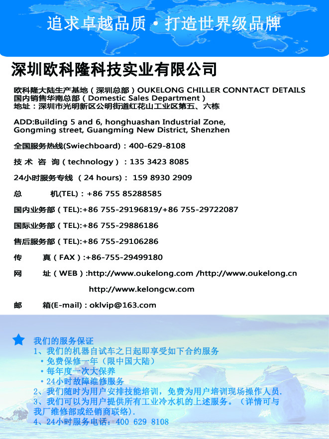 公司是一家集设计研发、产品生产、市场营销、技术服务为一体的大型专业冷水机产品制造企业,主营工业冷水机组、低温冷水机、风冷式冷水机,工业冷水机|风冷式工业冷水机|工业用冷水机,冷水机价格_冷水机_冷水机组_低温工业冷水机,冷水机生产厂家专注于工业冷水机研发与生产行业领先品牌。公司主营:冷水机,工业冷水机,螺杆式冷水机,风冷/水令式冷水机,低温冷水机,模温机等非标机型定制。
