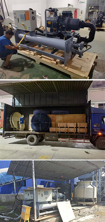 本案为出口到东南亚某国,为注塑厂中央供水系统冷水机组案例。采用两套60匹水冷螺杆式冷水机组,制作精良,品质优异深受用户好评。